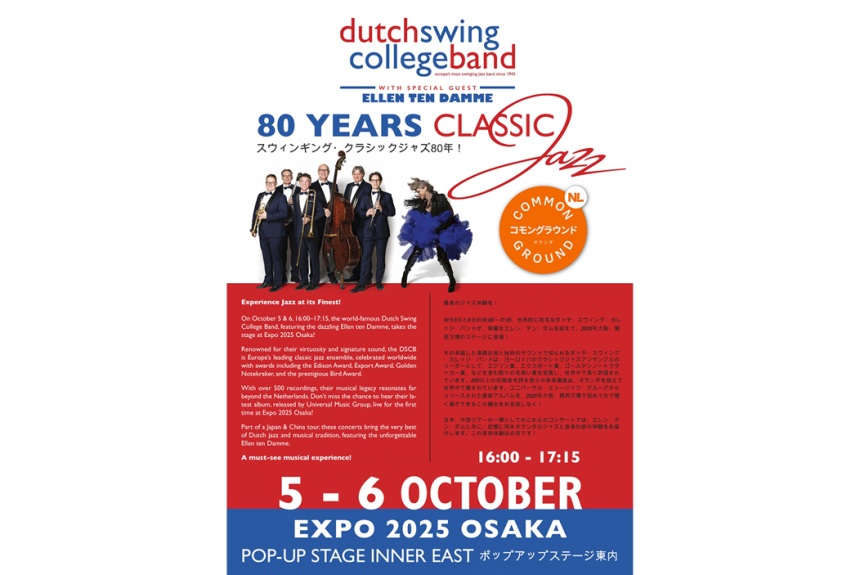欧州クラシックジャズの名門、ダッチ・スウィング・カレッジ・バンド(Dutch Swing College Band) が、 神戸ジャズストリートへの出演に先立ち、歌手 エレン・テン・ダム(Ellen ten Damme) とともに、 万博会場のステージに登場します。